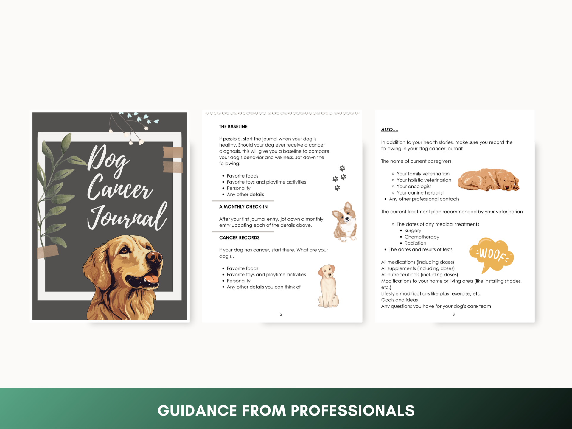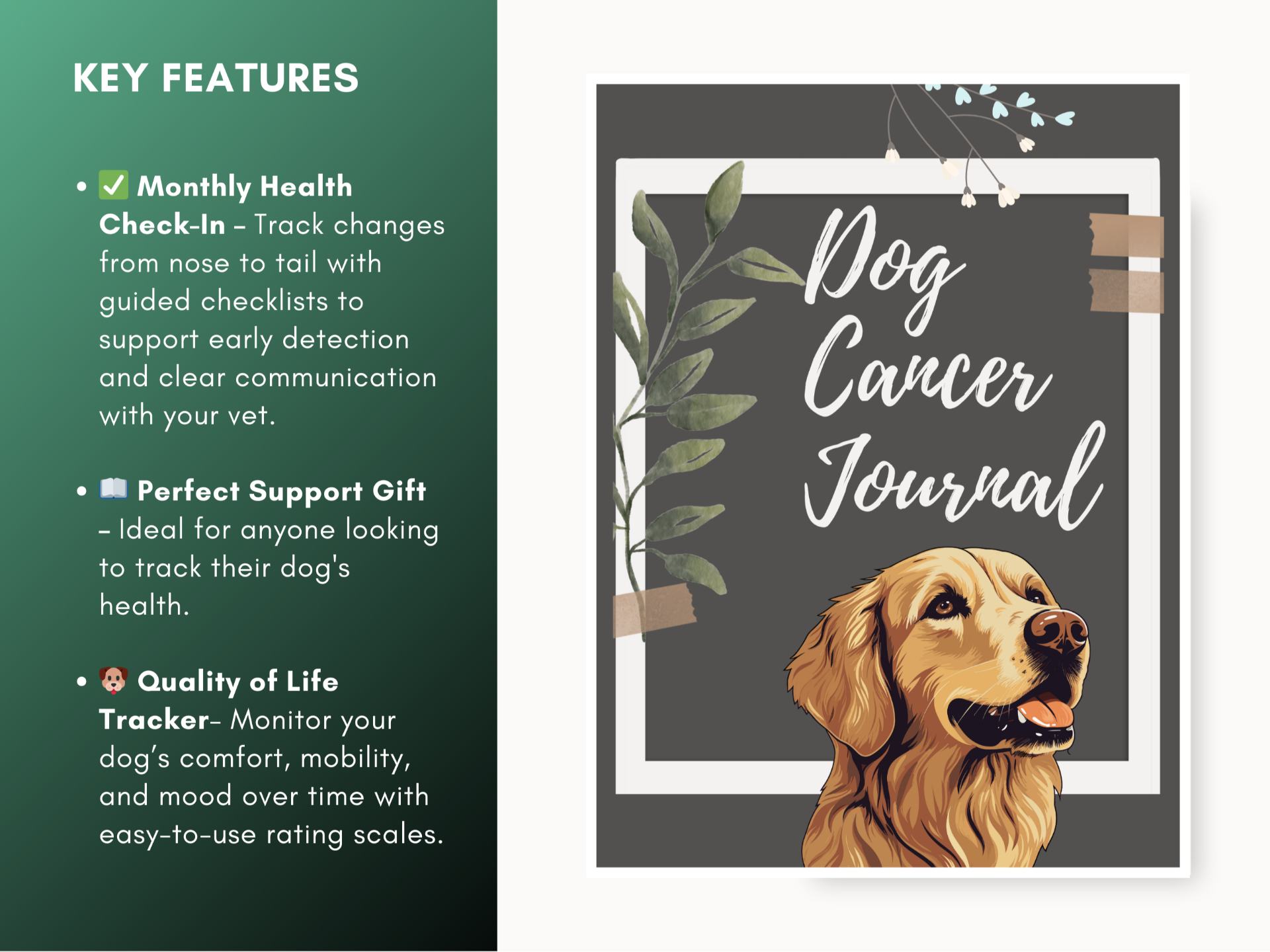 Navigating your dog’s cancer diagnosis is overwhelming—but you don’t have to do it alone. The Dog Cancer Journal is a beautifully designed, compassionate tool created to support you every step of the way. More than just a journal, it’s a heartfelt companion that helps you stay organized, track important health changes, and honor the bond you share with your dog.